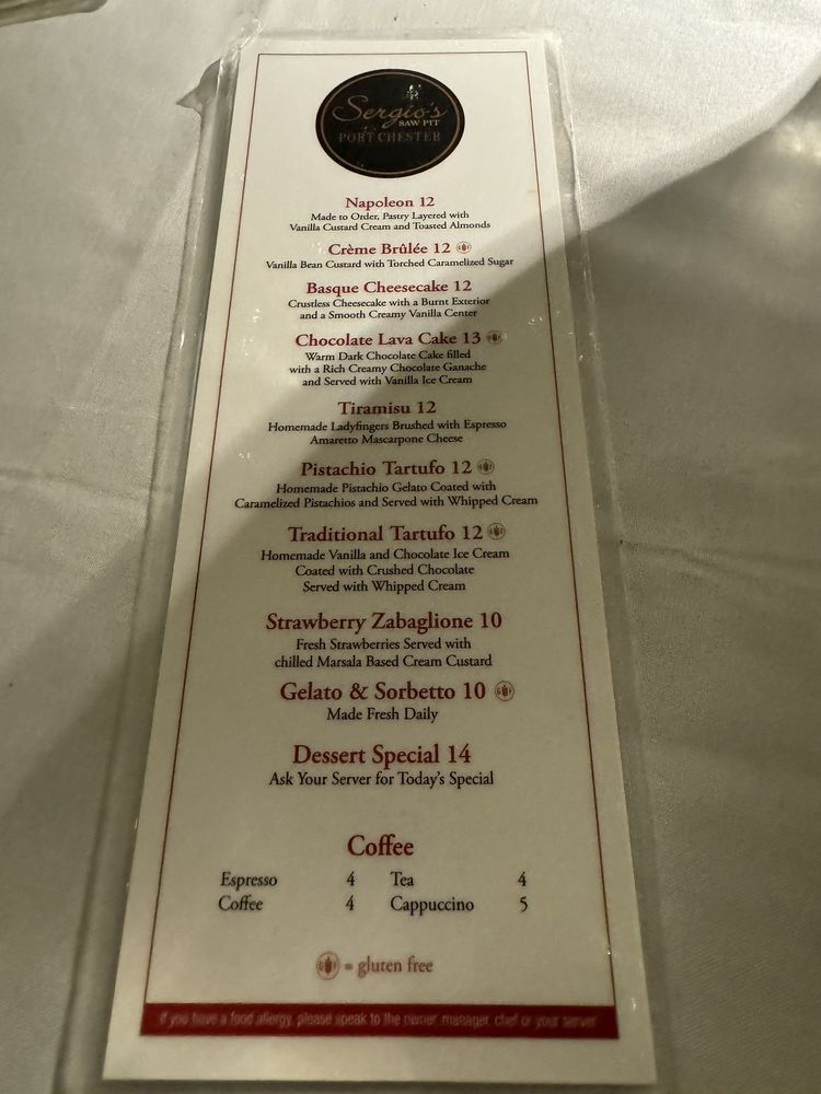 Located in Port Chester, NY, Sergio’s Sawpit Portchester is an upscale Italian restaurant that offers a visually appealing ambiance perfect for a night out. With amenities like outdoor seating, wheelchair accessibility, and a full bar, this restaurant caters to a diverse range of customers. The menu features dishes like veal Marsala, carpaccio, and pollo alla Diavola, all expertly prepared and flavorful according to customers' reviews. The attentive staff, beautiful holiday decorations, and impressive array of homemade pasta make Sergio’s Sawpit Portchester a standout dining experience. With its impeccable service and high-quality dishes, this restaurant is an ideal choice for a sophisticated evening out.